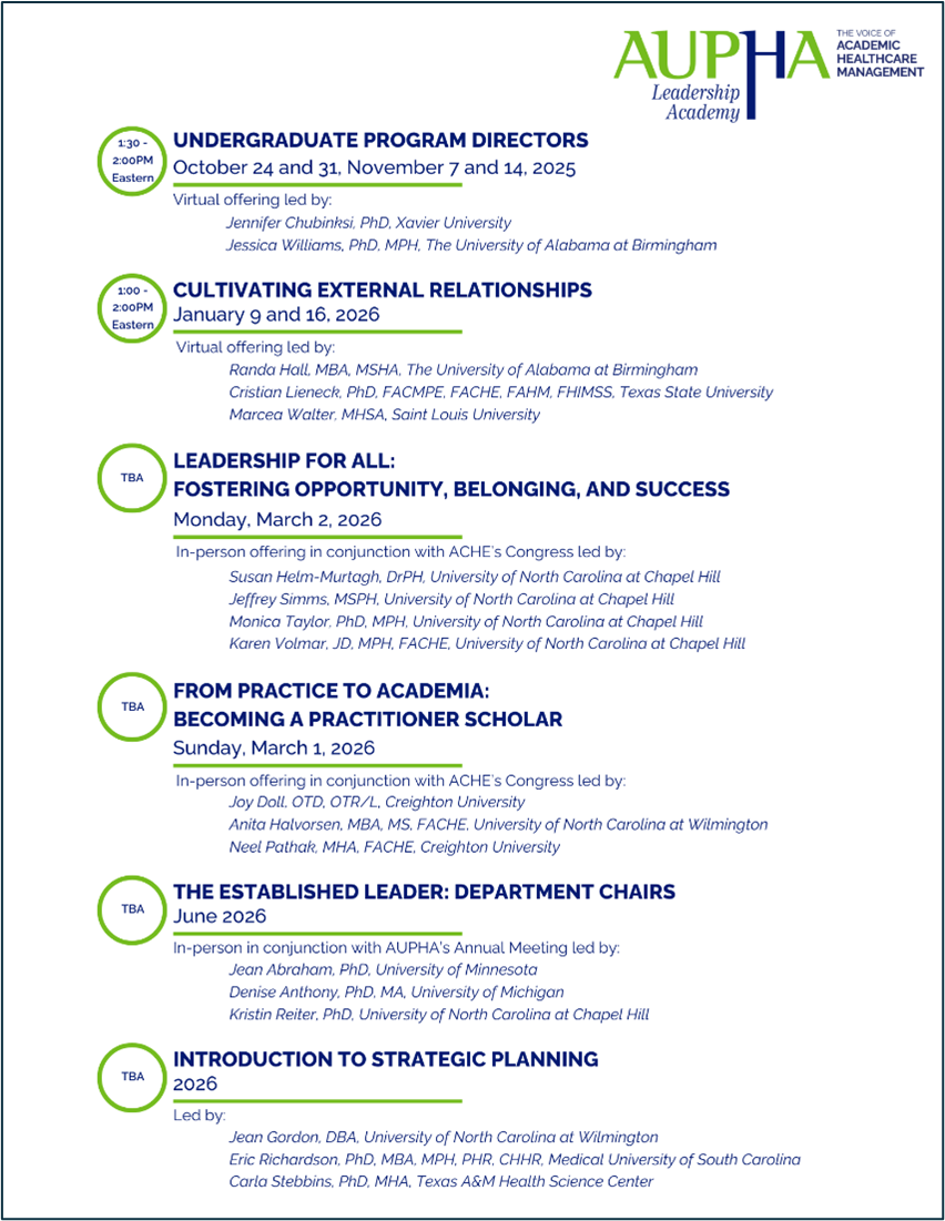 AUPHA is excited to announce the development of several new courses for the Leadership Academy, each of which will launch between now and the end of 2026. These courses provide multiple new pathways for earning the Certificate for Leadership in Healthcare Management Education, a credential that recognizes faculty committed to continuous learning and improvement in academic leadership.