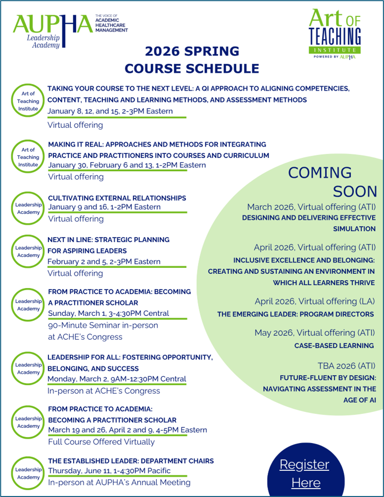 Registration is now open for several courses in the Art of Teaching Institute and Leadership Academy in 2026. Individuals planning to complete the Certificate for Teaching in Healthcare Management or the Certificate for Leadership in Healthcare Management Education can use the schedule below to plan their pathway towards the completion.