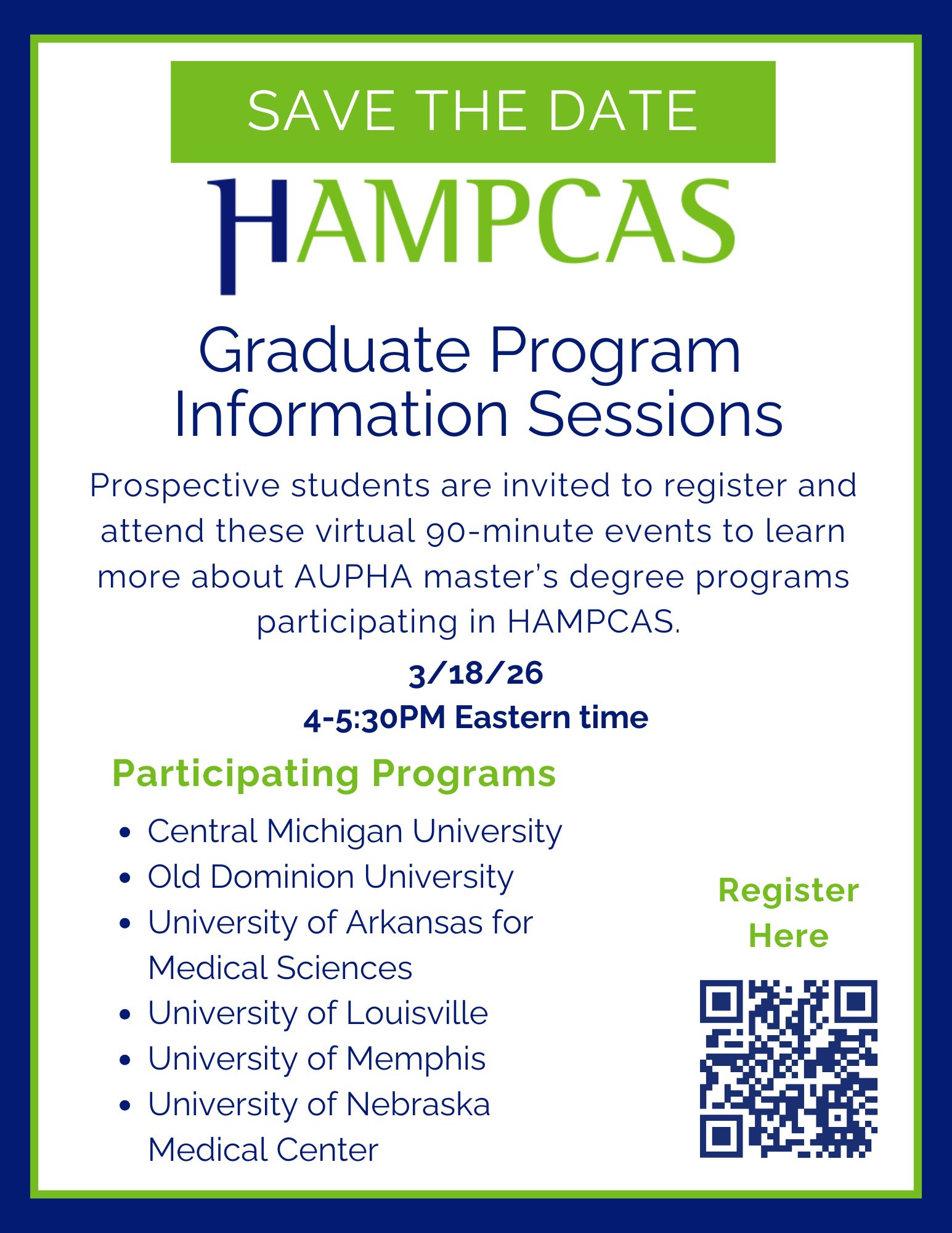 To aid students in the research and application process, AUPHA will periodically host graduate program information sessions. They will each highlight several AUPHA graduate program members utilizing HAMPCAS and provide an opportunity to connect directly with program faculty and/or staff.